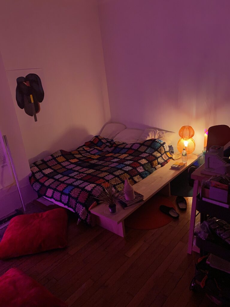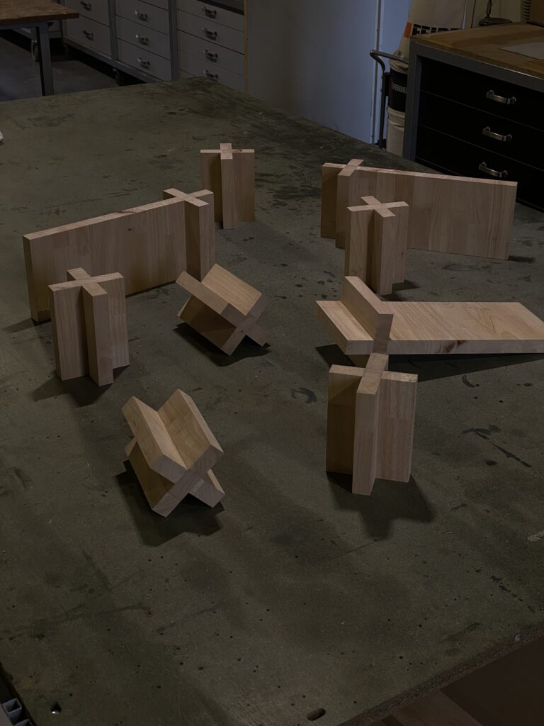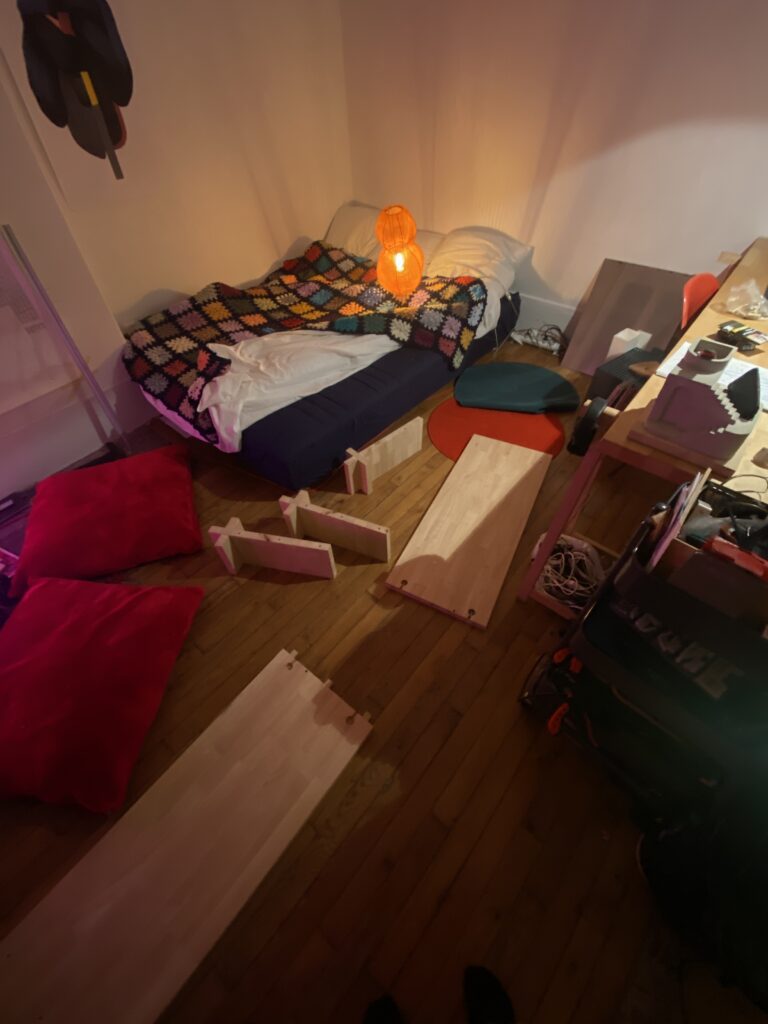 Ensemble de pieds de lit réalisés en hévéa massif. Neuf modules assemblés par emboîtement forment une structure stable sans fixation mécanique. Une planche latérale vient se fixer sur le côté gauche du lit, prolongeant l’ensemble pour créer une table de nuit intégrée.
