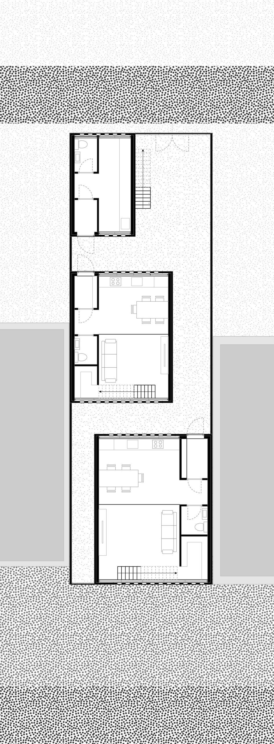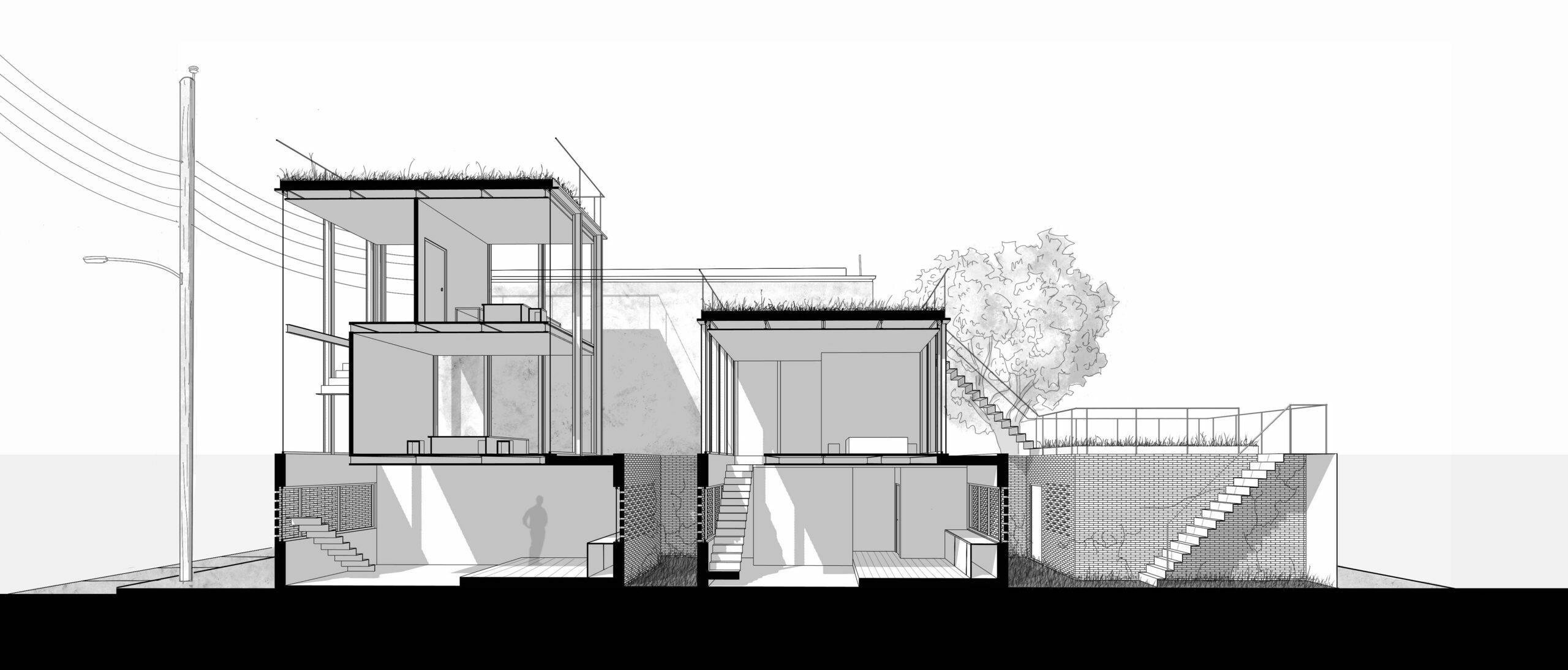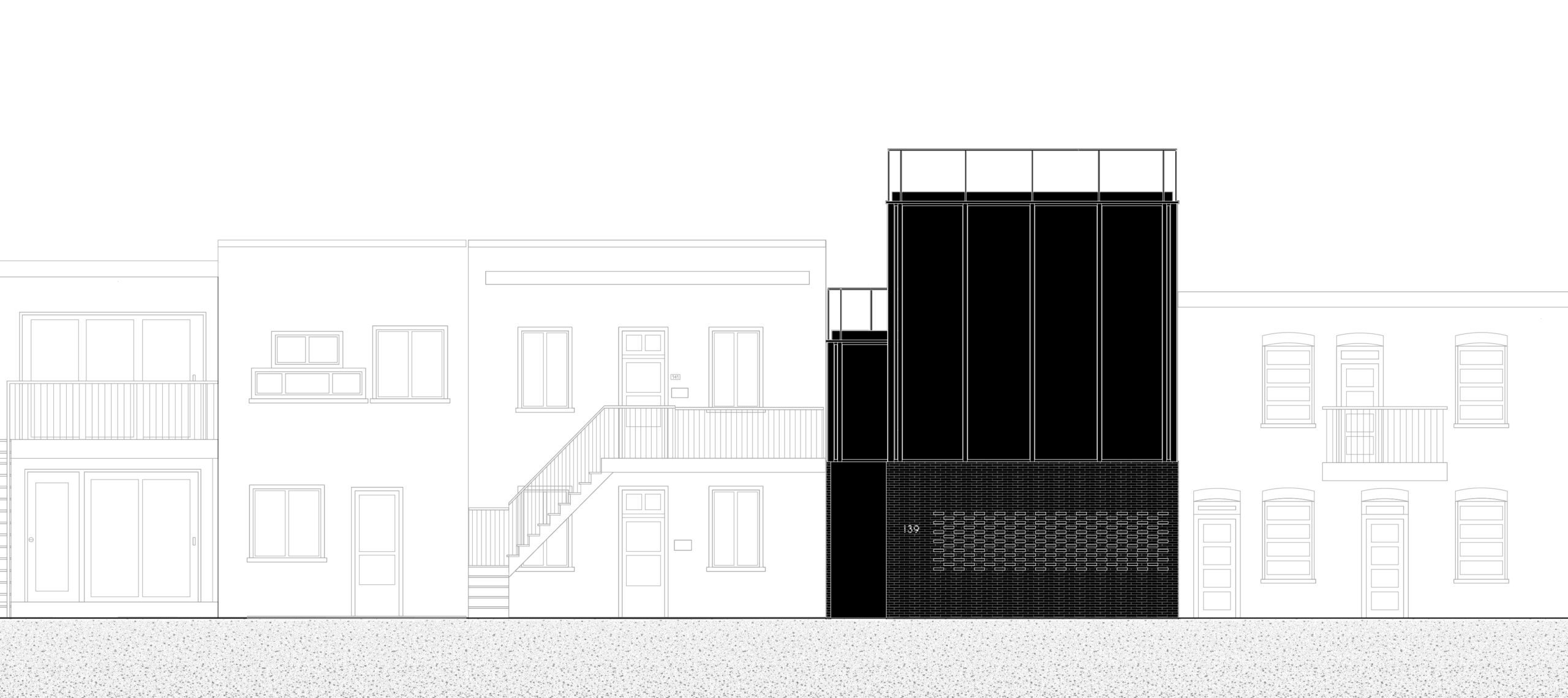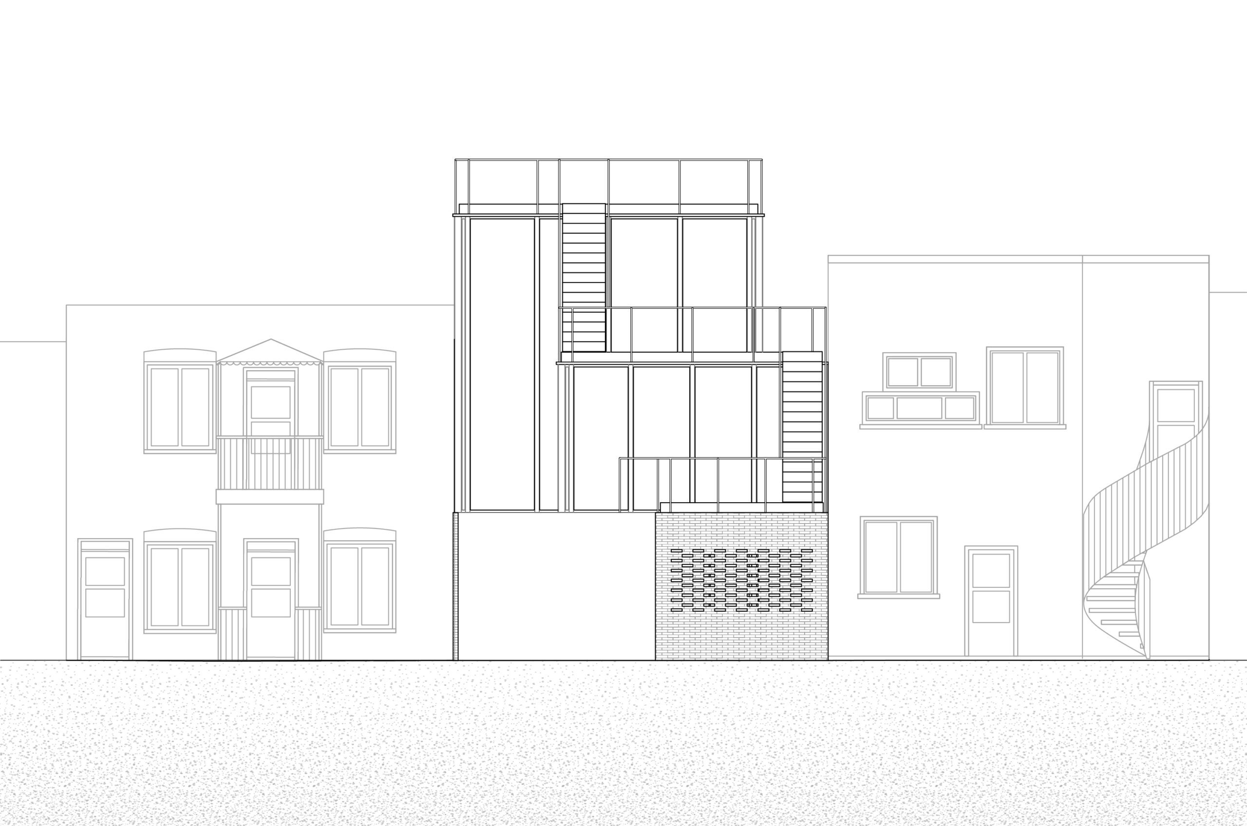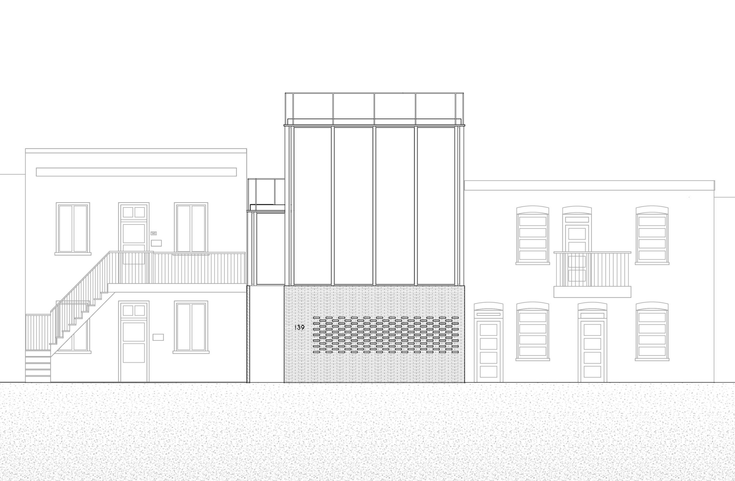 En plein cœur du quartier Mile-Ex à Montréal, le duplex multigénérationnel se fragmente en 3 blocs distincts accueillant respectivement deux couples et un atelier. Le rez-de-chaussée, entièrement en brique, s'isole afin de préserver l'intimité au niveau de la rue, tandis que les étages, entièrement vitrés, baignent l'ensemble des espaces de lumière. La décroissance évidente des blocs s'opère afin de s'adapter au contexte et à l'espace nécessaire au programme.