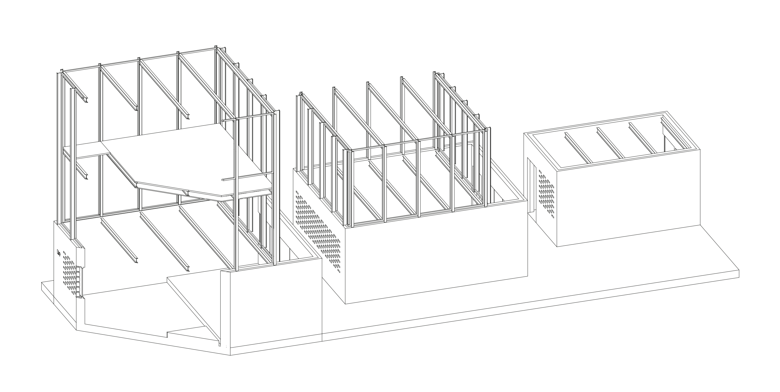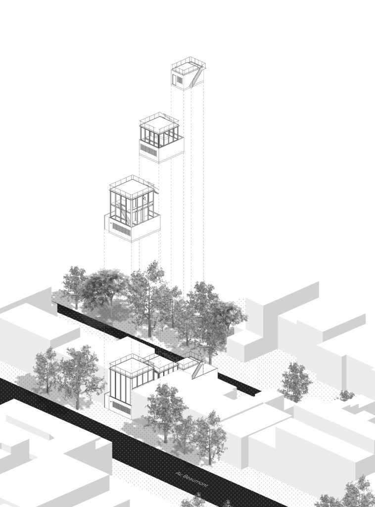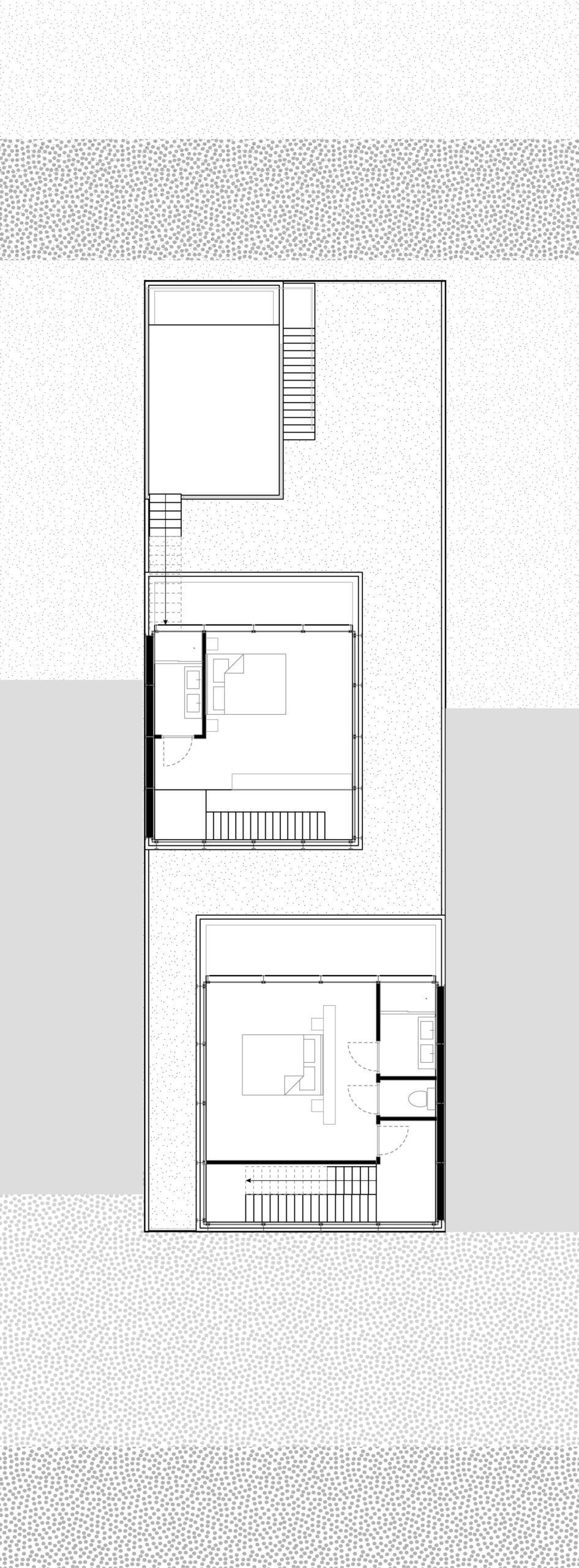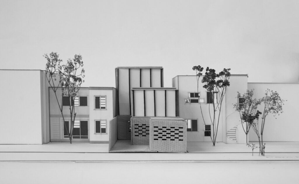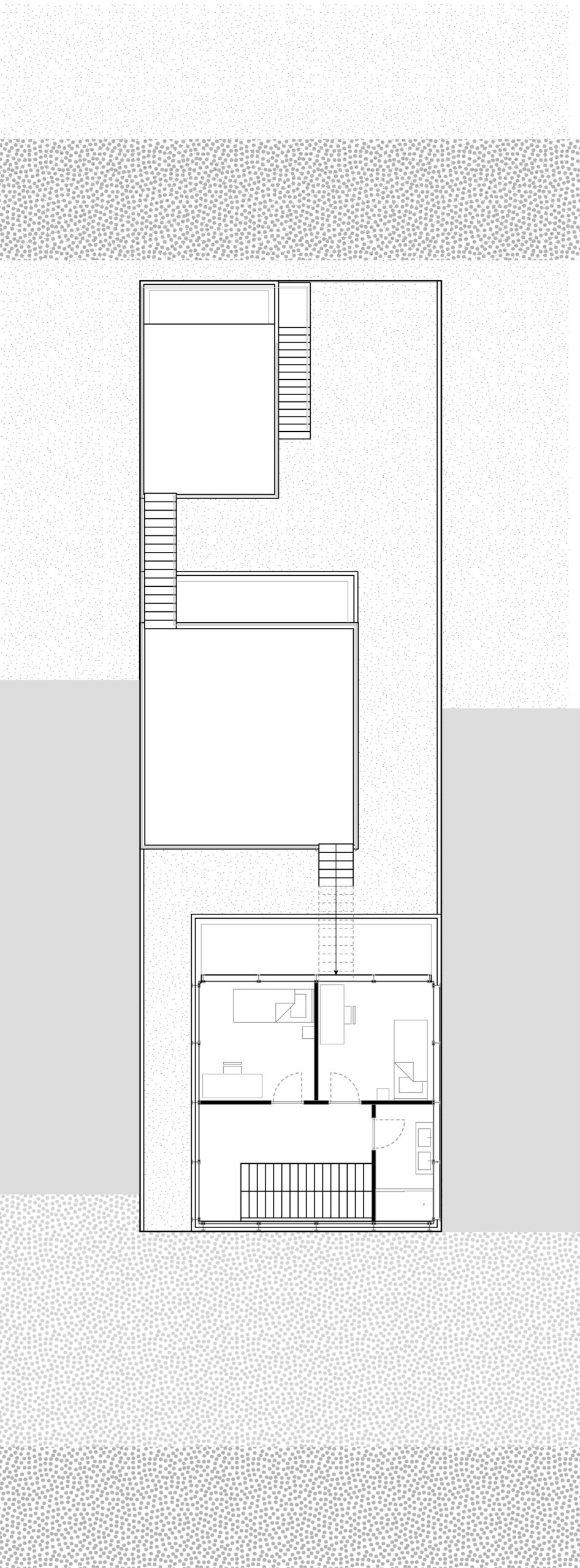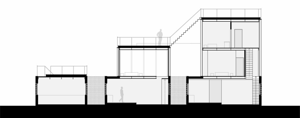 En plein cœur du quartier Mile-Ex à Montréal, le duplex multigénérationnel se fragmente en 3 blocs distincts accueillant respectivement deux couples et un atelier. Le rez-de-chaussée, entièrement en brique, s'isole afin de préserver l'intimité au niveau de la rue, tandis que les étages, entièrement vitrés, baignent l'ensemble des espaces de lumière. La décroissance évidente des blocs s'opère afin de s'adapter au contexte et à l'espace nécessaire au programme.