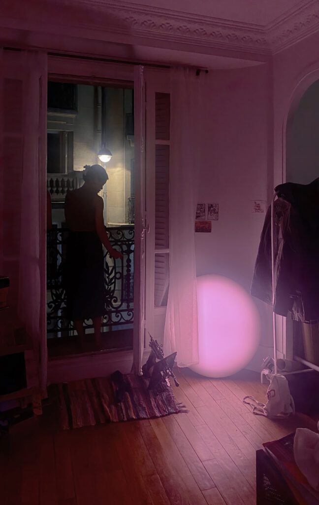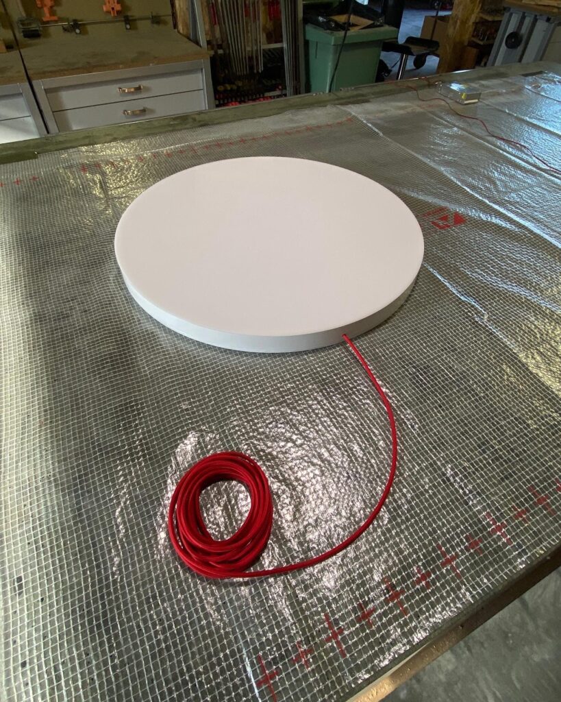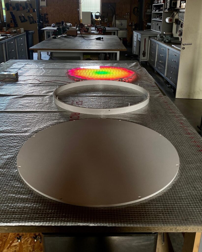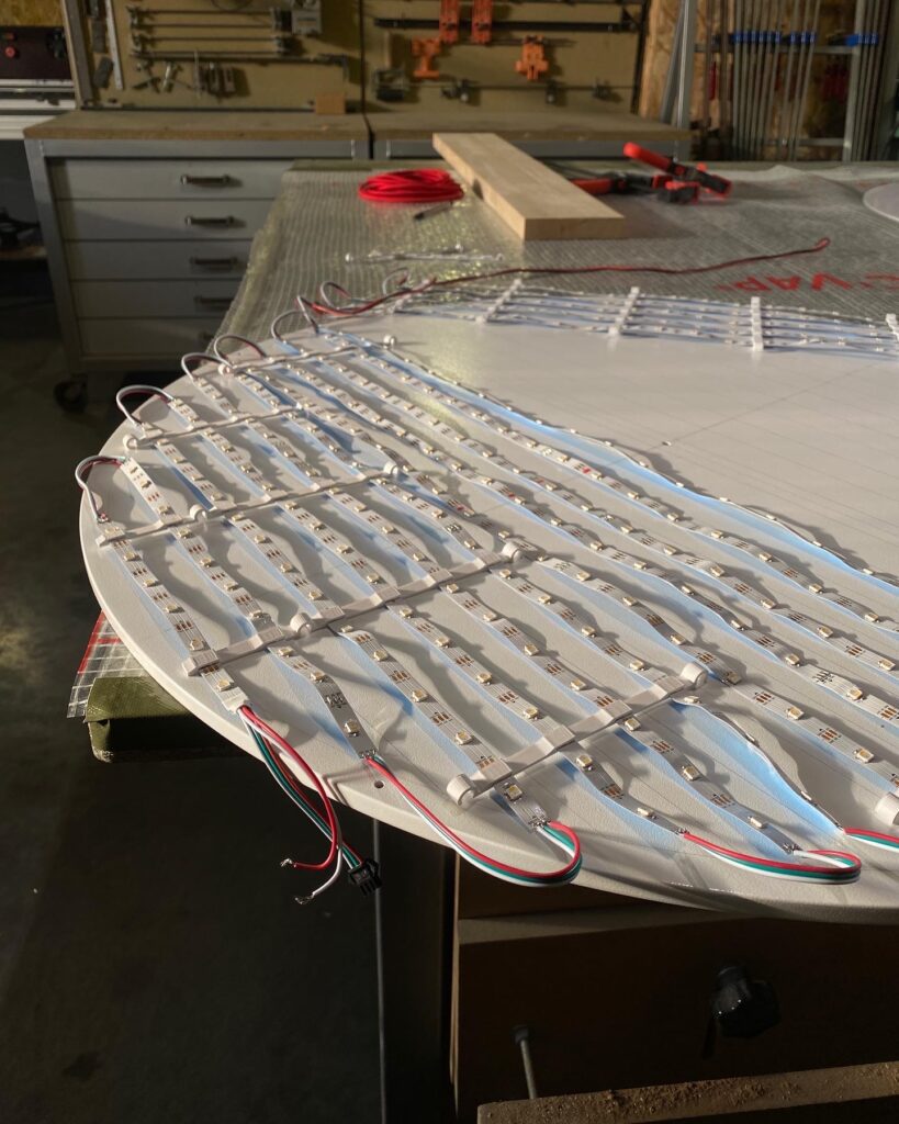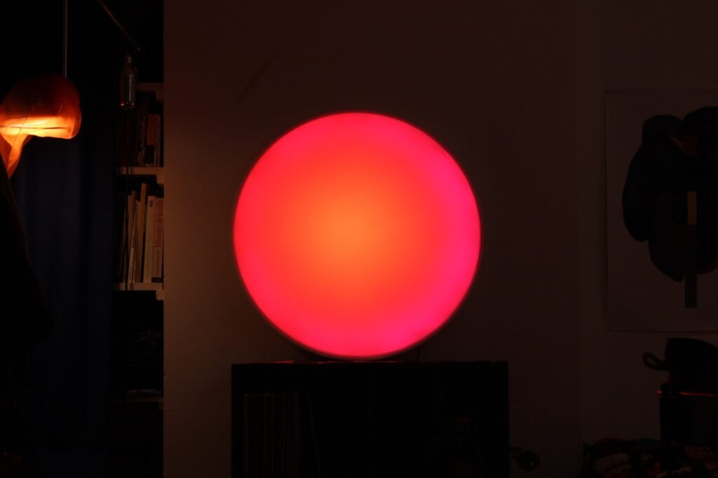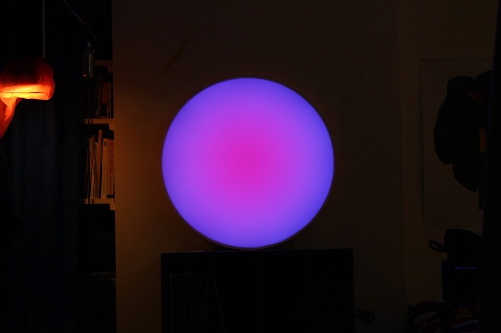 Le châssis en bois peint de la lampe Halo héberge pas moins de 375 leds adressables. Une centaine de ligne de commande injectées dans un microcontrôleur viennent tout d’abord traduire le motif imaginé par mes soins en un signal binaire. Il dicte à chaque led la teinte rouge, verte, bleu et blanche précise qu’elle doit produire. Cette précision s’estompe finalement, les nuances se perdent et se mélangent à travers la surface de plexiglas. Les couleurs approximatives et confondues se diffusent doucement dans la pièce, se reflètent sur le sol, nous hypnotisent quelques instants.