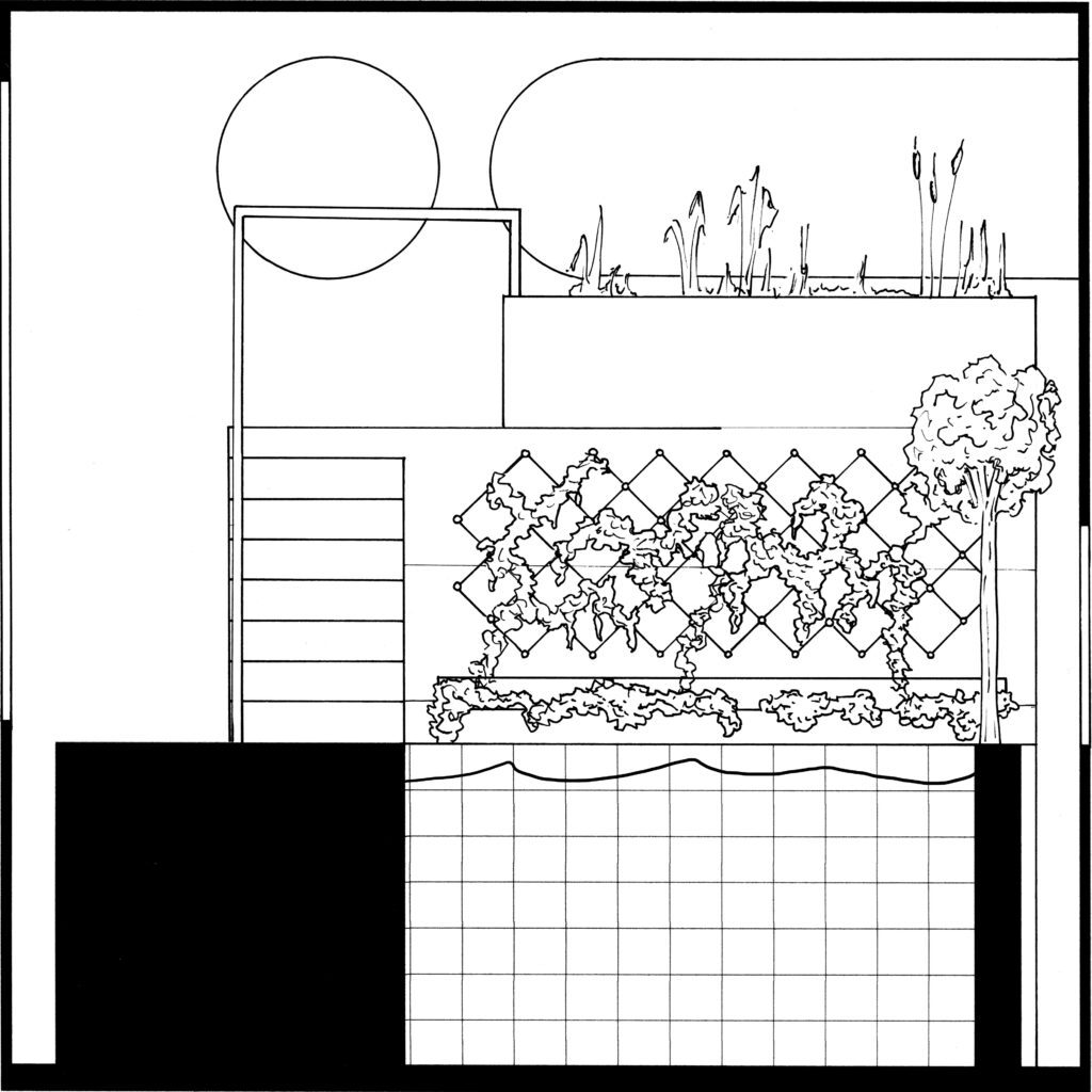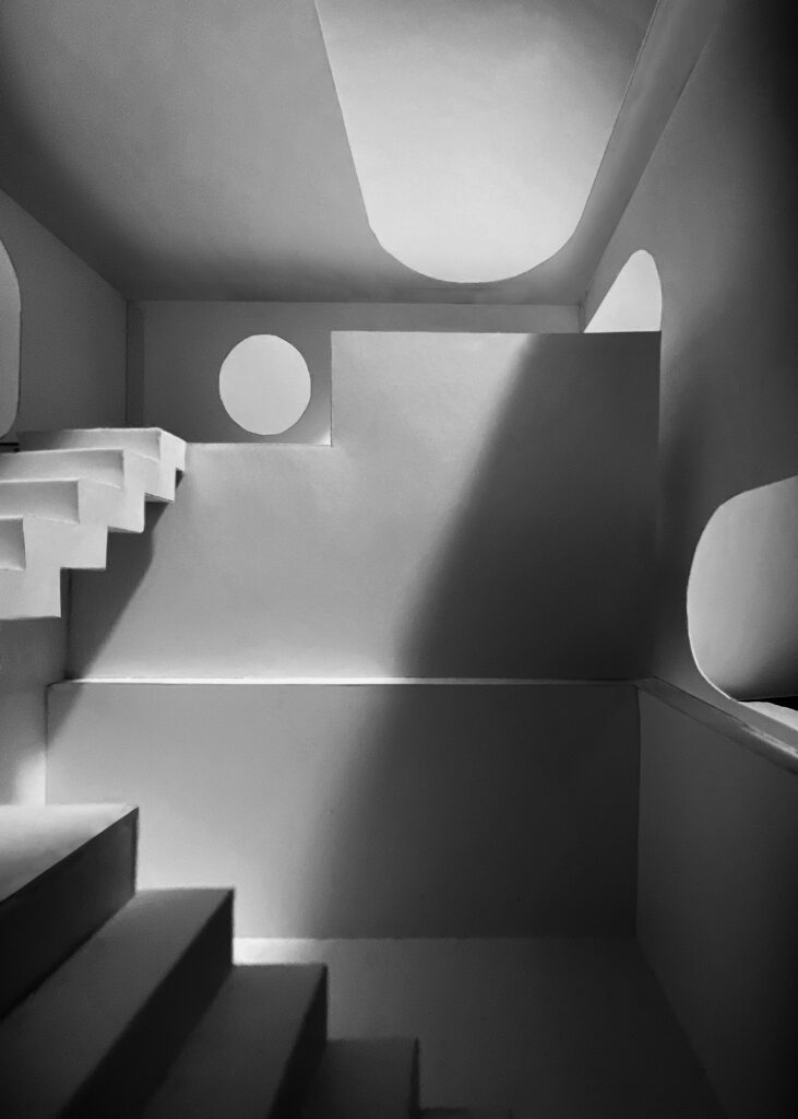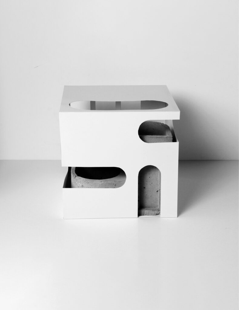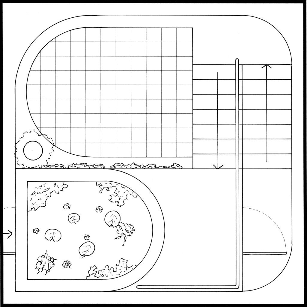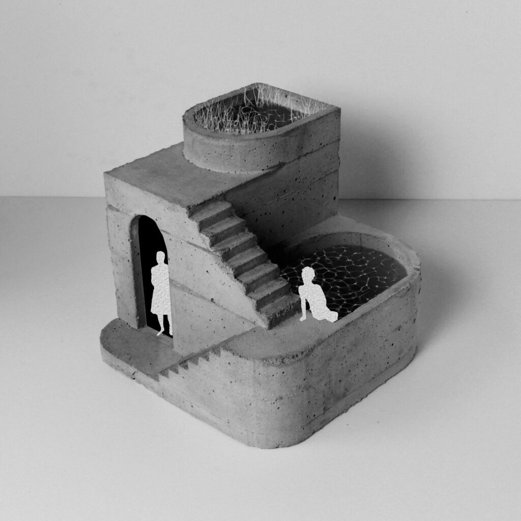 Contrainte à cinq mètres de côté, cette pièce de méditation s’inscrit dans une recherche formelle par la matière. La création de maquettes en ciment, mortier et béton s’est avéré contraindre la forme architecturale final du fait de l’intermédiaire de conception qu’est le moulage. La forme finale comprend ainsi deux bassins interdépendants. Ils agissent comme moyen de filtrage et lieu de baignade, et permettent au visiteur de s’y détendre. La paroi échappe quant à elle à cette contrainte et dirige intelligemment la lumière à l’intérieur de la pièce.