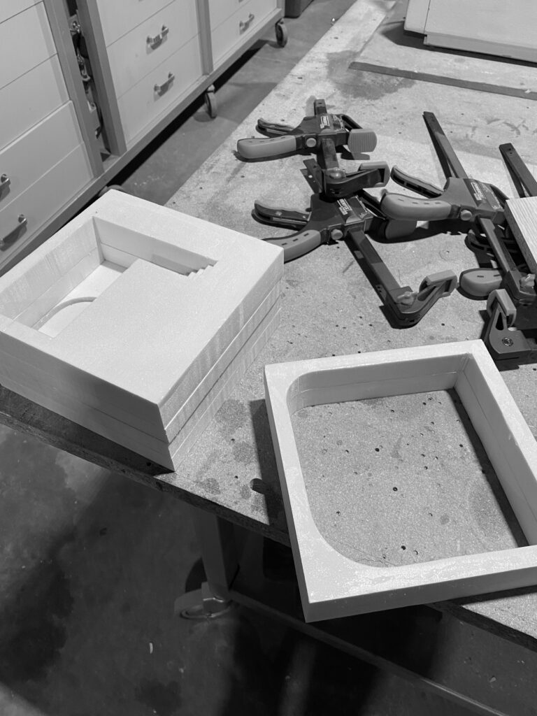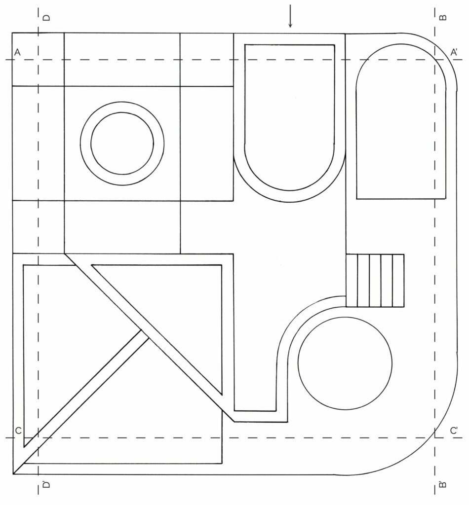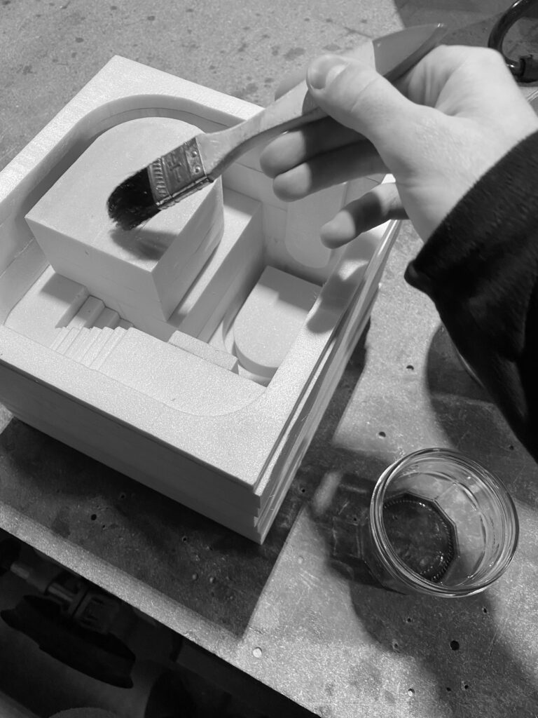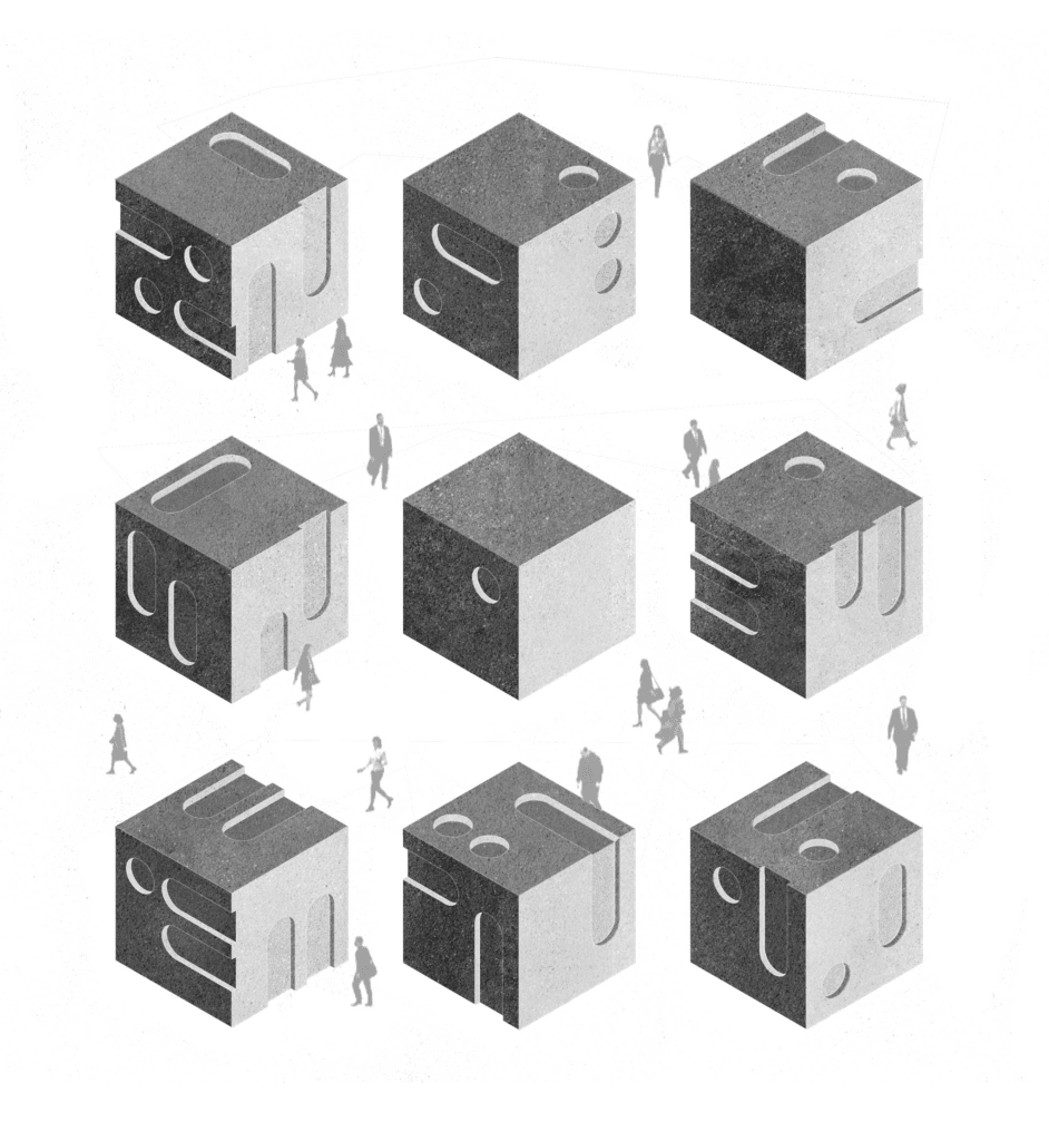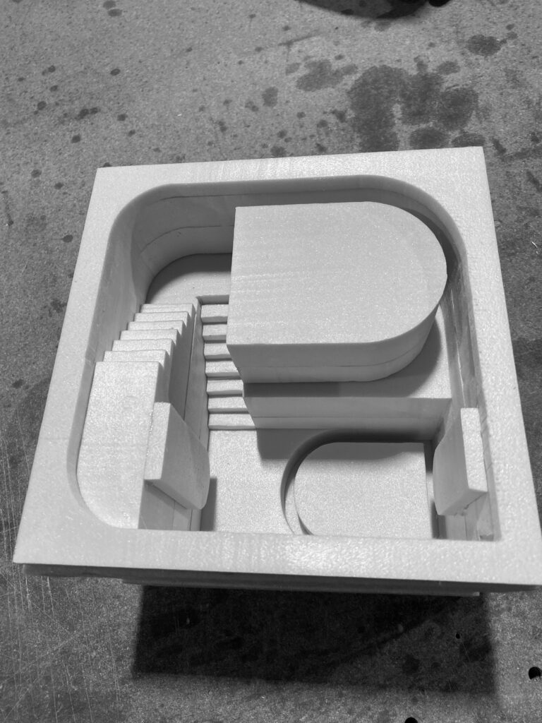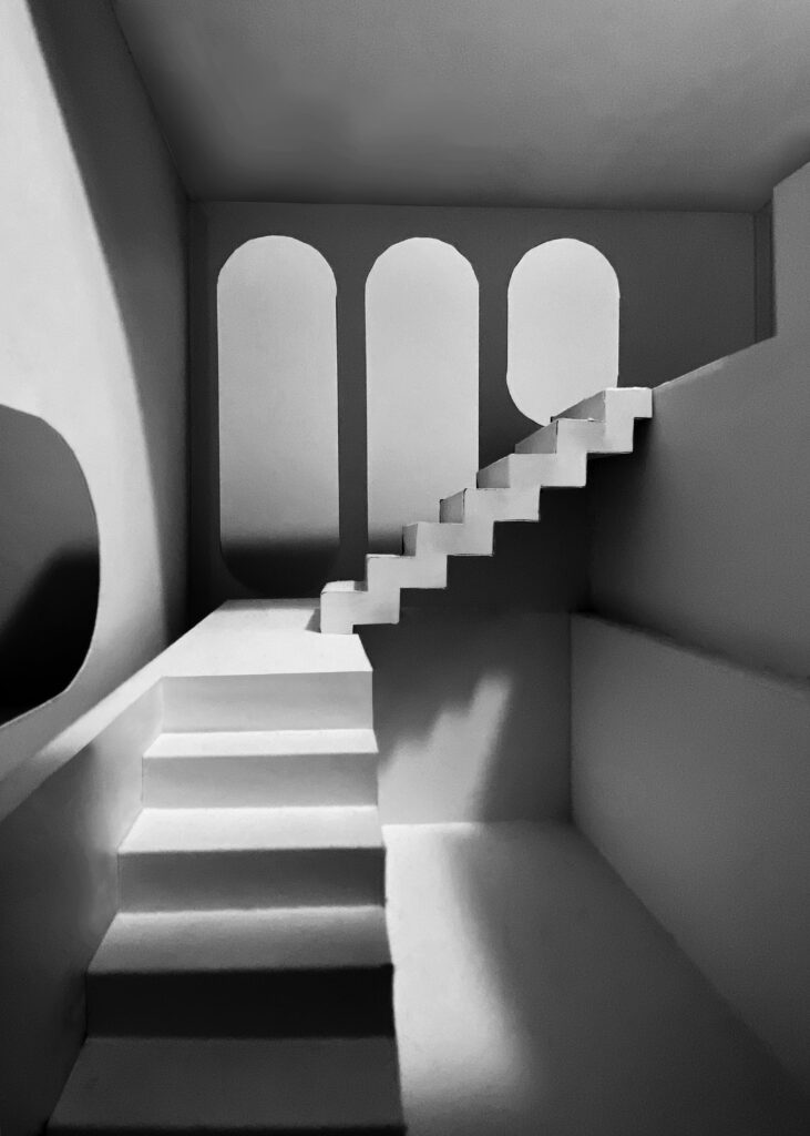Contrainte à cinq mètres de côté, cette pièce de méditation s’inscrit dans une recherche formelle par la matière. La création de maquettes en ciment, mortier et béton s’est avéré contraindre la forme architecturale final du fait de l’intermédiaire de conception qu’est le moulage. La forme finale comprend ainsi deux bassins interdépendants. Ils agissent comme moyen de filtrage et lieu de baignade, et permettent au visiteur de s’y détendre. La paroi échappe quant à elle à cette contrainte et dirige intelligemment la lumière à l’intérieur de la pièce.