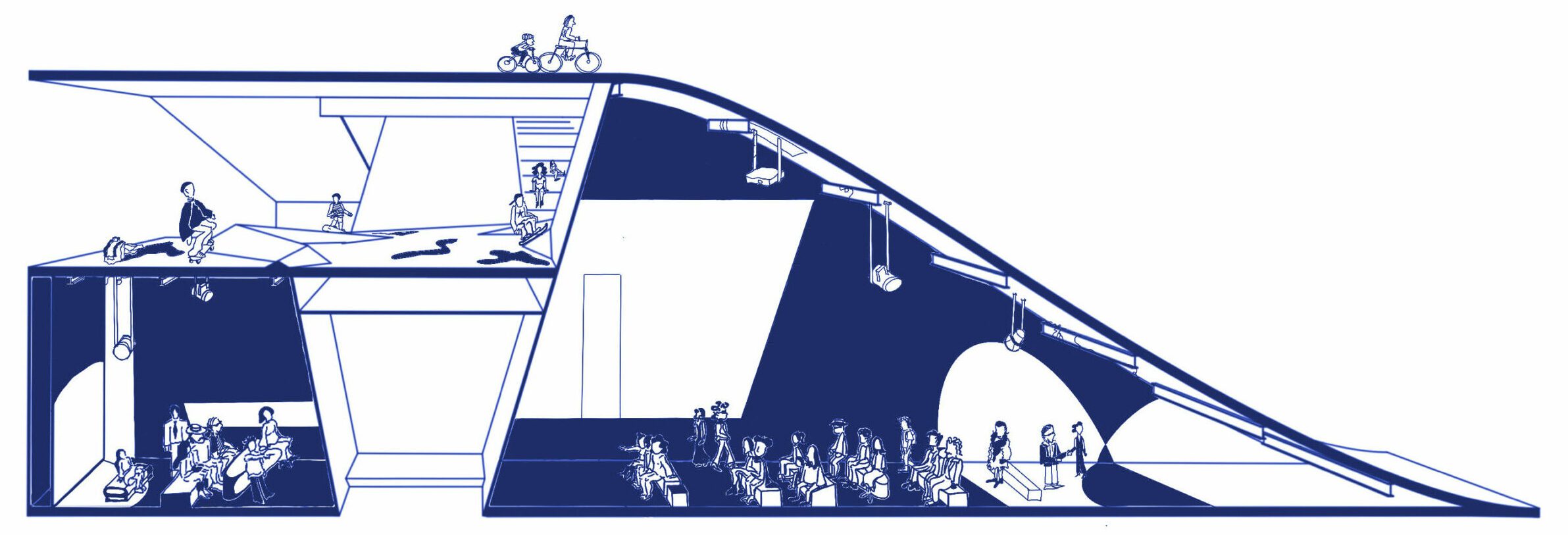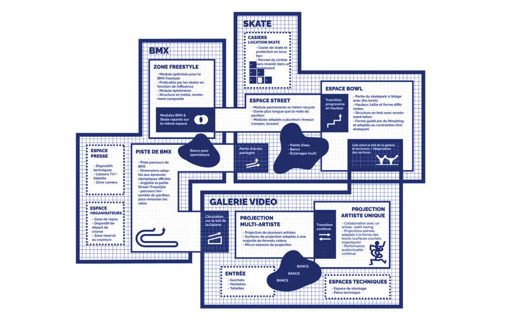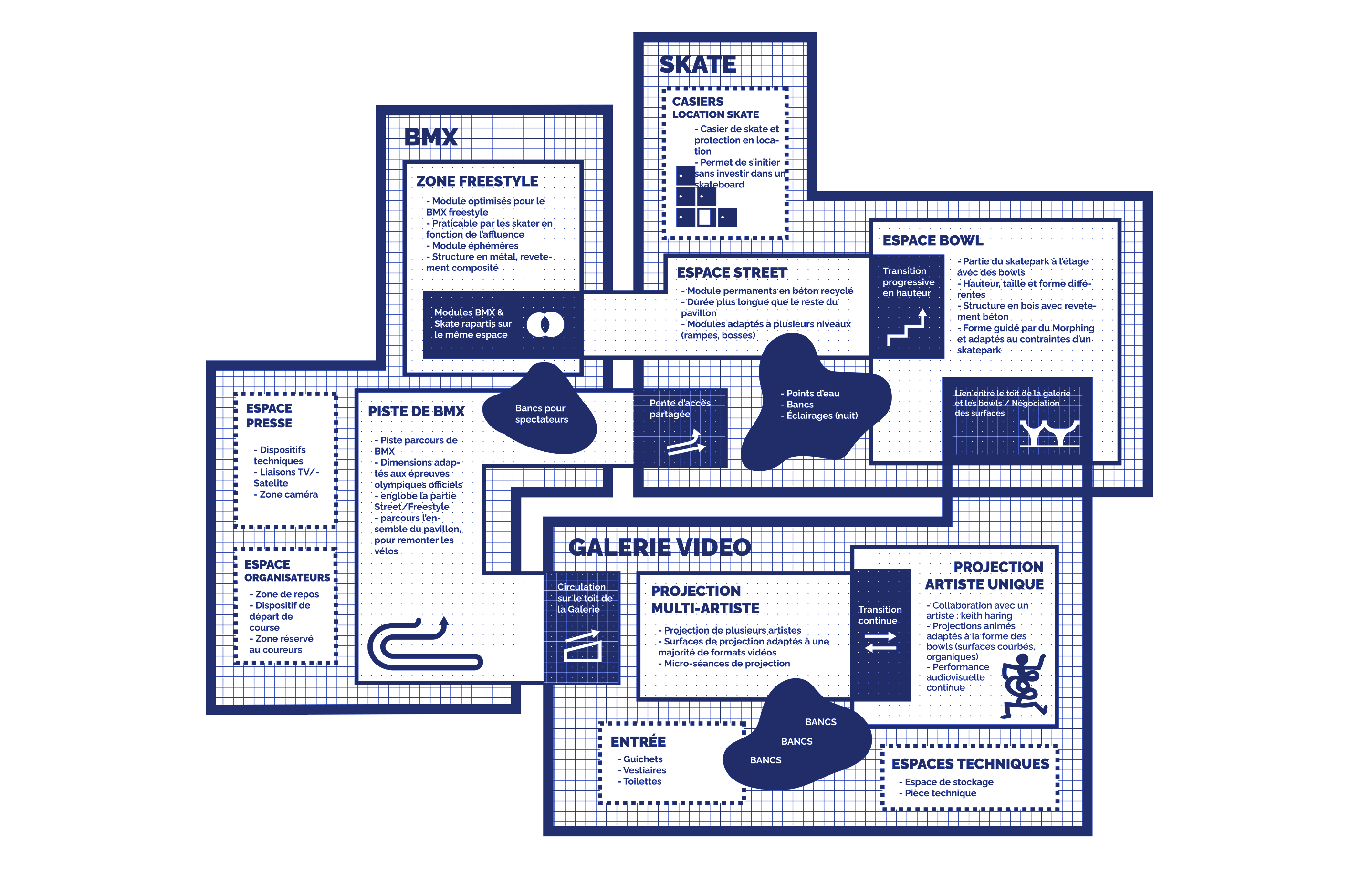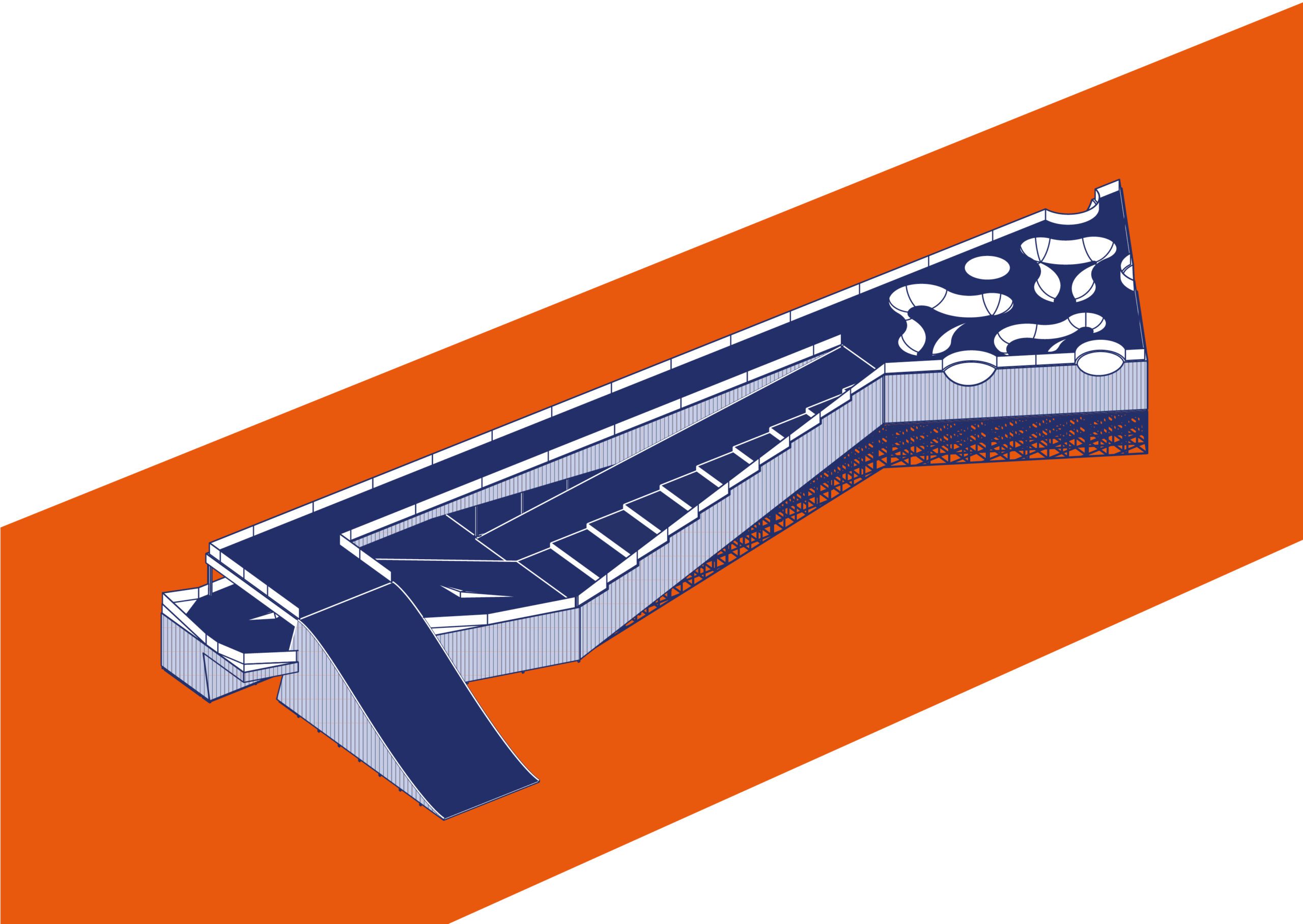 Dans le cadre des Jeux olympiques de Paris en 2024, cet exercice avait pour objectif de concevoir une série de pavillons sur les Champs-Élysées, combinant des activités culturelles et sportives. Notre projet s'organise autour de trois programmes : le skateboard, le BMX et une galerie d'art vidéo. Une ascension sur deux niveaux superposés s'intègre dans la continuité de la rue, où les activités sportives et culturelles coexistent sans jamais se rencontrer.