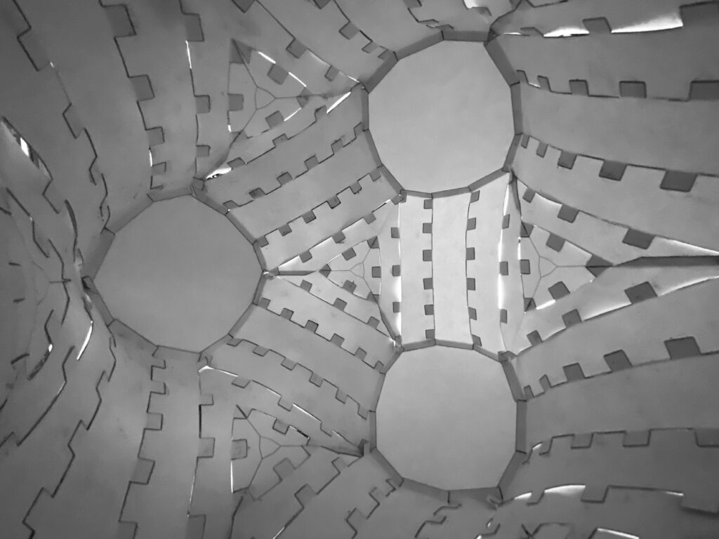 Réalisée dans le cadre d'un intensif sur les structures en toile tendue, la lampe Tensio reproduit en papier une simulation physique d'une surface minimale. Conçue à l'aide de Rhinocéros et Grasshopper, un traitement a été nécessaire pour décomposer la géométrie en une structure pliable en papier. Une attention particulière a également été portée aux languettes en papier qui, une fois rétro-éclairées, deviennent un élément distinct de la lampe.