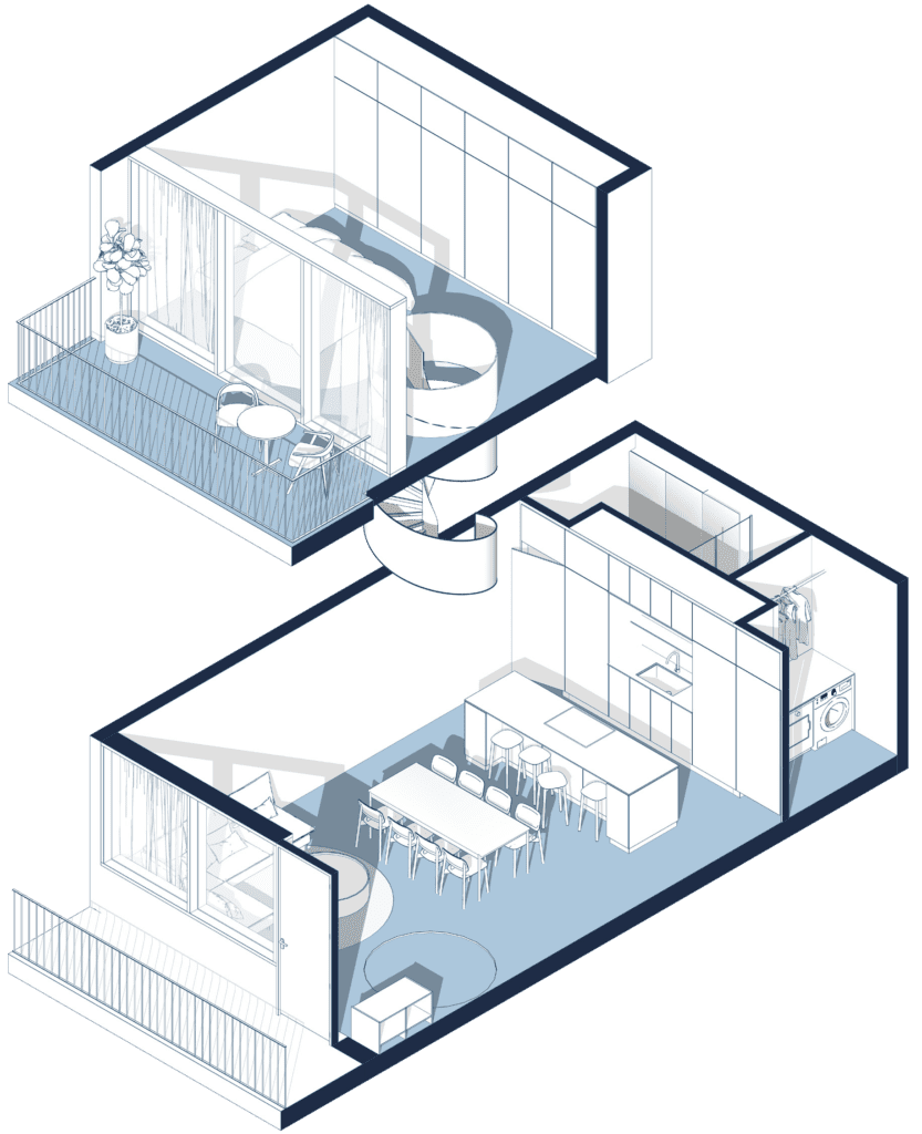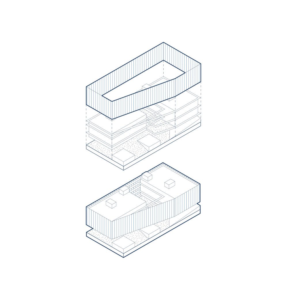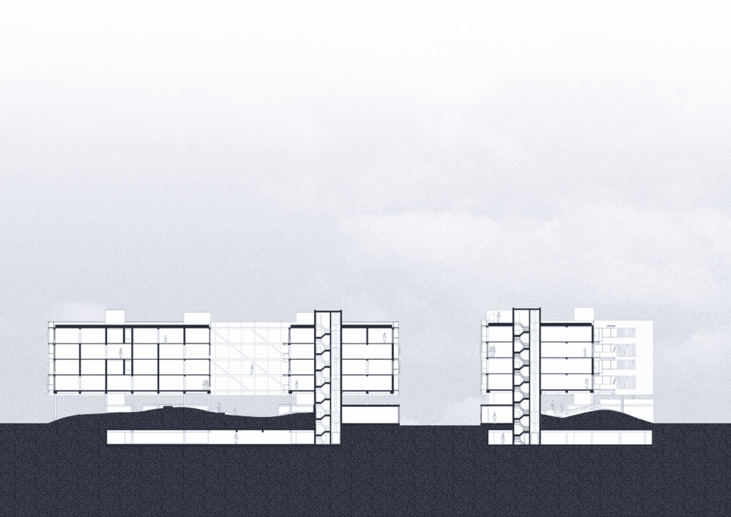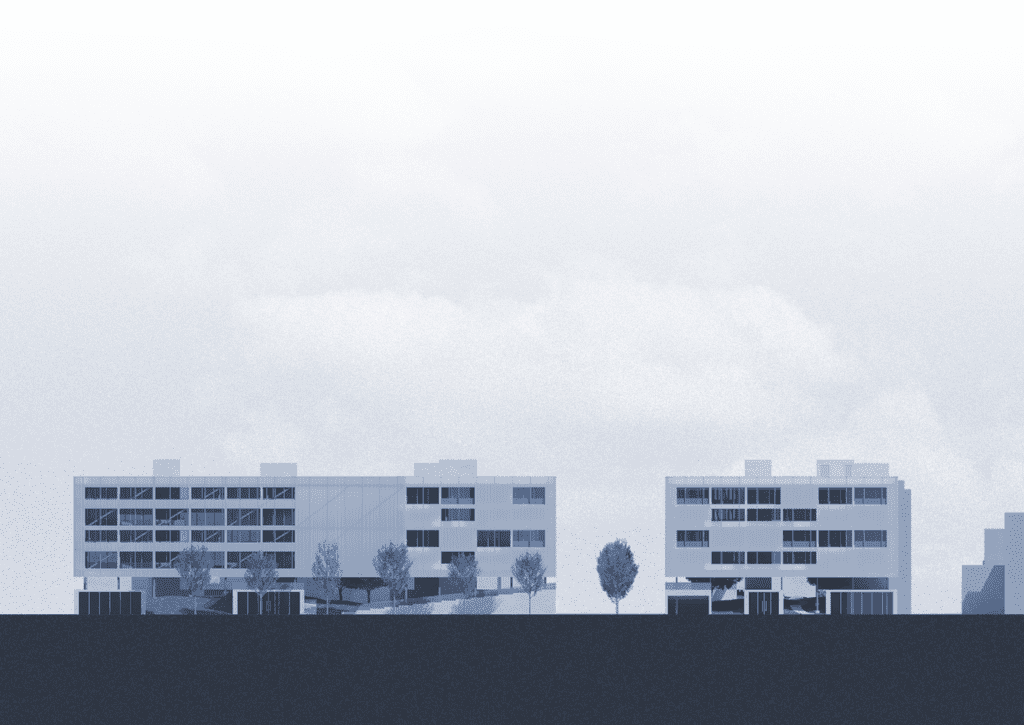 Le duplex montréalais, pilier de la culture architecturale au Québec, représente un symbole, un mode de vie. Face à la crise du logement au Canada, la création d’un complexe d’habitation dense se devait de respecter cet héritage culturel et social. Les deux unités de duplex s’élèvent ainsi pour donner intimité et confort aux habitations alors que les commerces se fondent avec la rue. Intégré dans une topographie artificielle, le rez-de-chaussée devient lieux de promenade et de repos. Une double peau enrobe enfin l’ensemble et lie cet assemblage disparate.