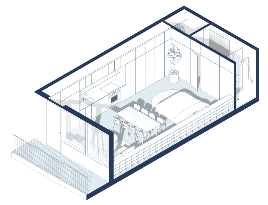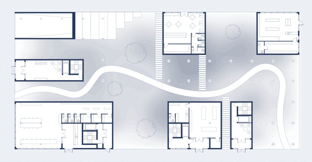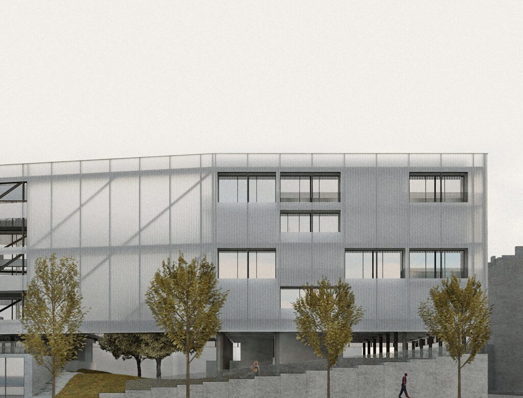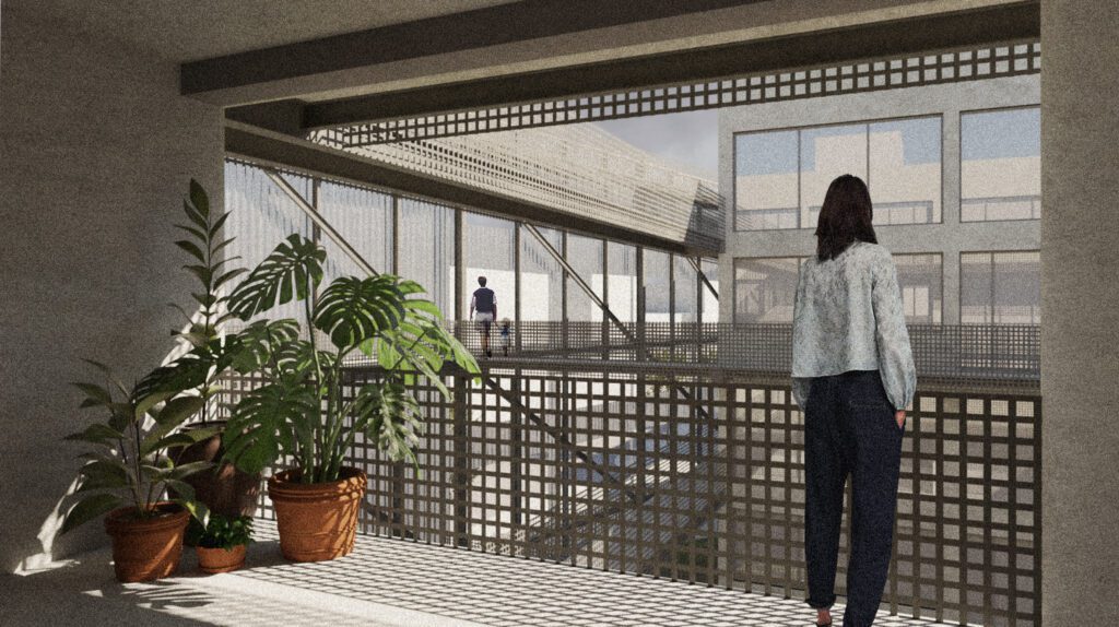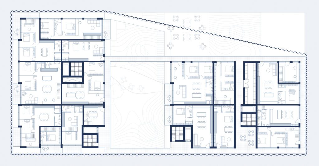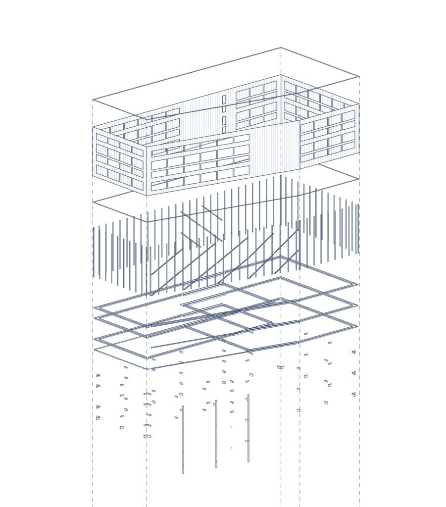Le duplex montréalais, pilier de la culture architecturale au Québec, représente un symbole, un mode de vie. Face à la crise du logement au Canada, la création d’un complexe d’habitation dense se devait de respecter cet héritage culturel et social. Les deux unités de duplex s’élèvent ainsi pour donner intimité et confort aux habitations alors que les commerces se fondent avec la rue. Intégré dans une topographie artificielle, le rez-de-chaussée devient lieux de promenade et de repos. Une double peau enrobe enfin l’ensemble et lie cet assemblage disparate.